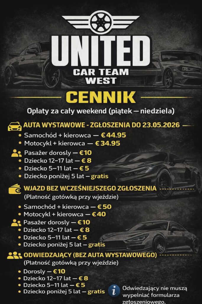 Facebook Instagram TikTok YouTube UCTW 2026 – Formularz zgloszeniowy Twoje dane / Your personal data Imię/Name: Nazwisko/Surename: E-mail Numer telefonu / Phone Marka i model pojazdu / Brand and model Numer rejestracyjny / Registration number Beda na: 1 dzien3 dni Ilość pasażerów doroslych(bez kierowcy) / Adults(without the driver) Ilość dzieci / Children: 0-5 5-12 12-18 Dodaj zdjęcia / Add photo's Pochwal się zmianami (opcjonalnie) / Tell something about your project Zapoznałem się z regulaminem i akceptuje jego treść. / I have read the regulations and accept their content.